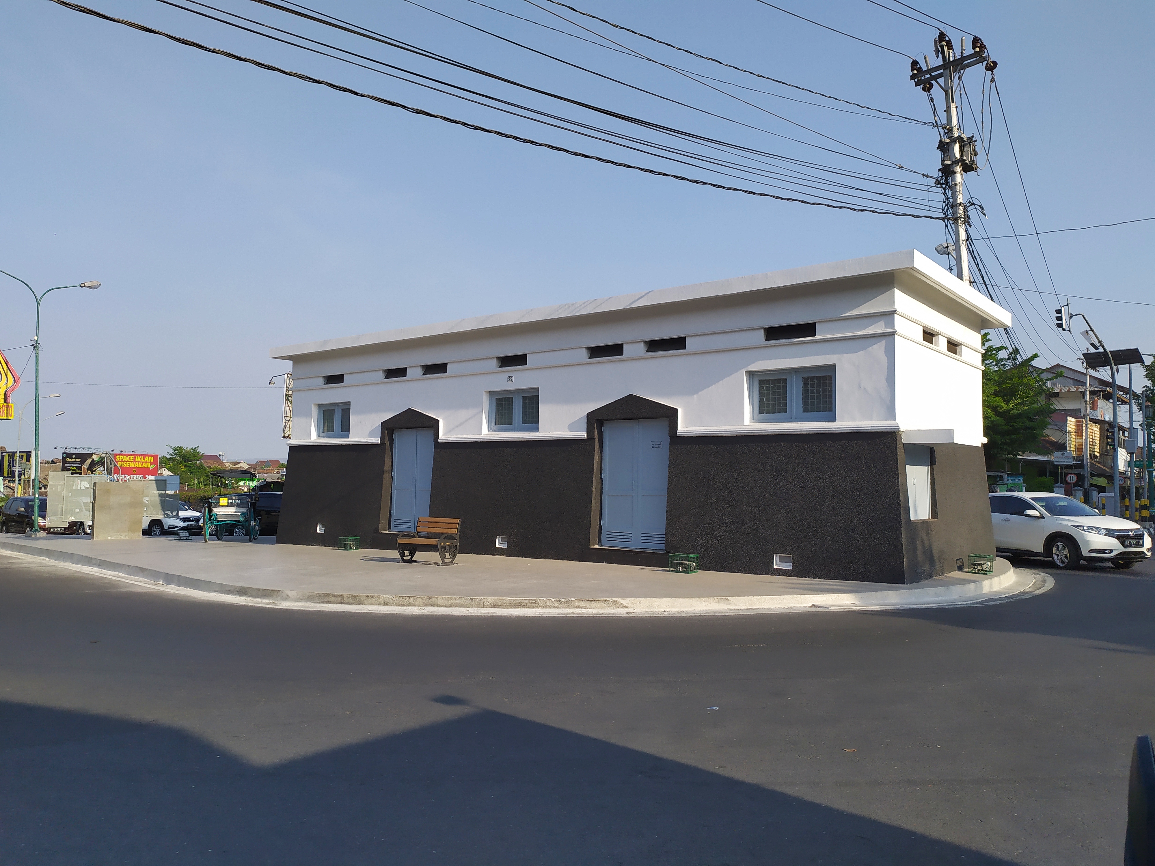 Secara keseluruhan bangunan berbahan pasangan bata dengan ditutup plester pada permukaannya. Bentuk atap datar (dak beton) dengan teritis ±40 cm menjorok di keempat sisi. Bagian depan bangunan (sisi utara) terdapat 7 lubang ventilasi berbentuk segi empat, 3 jendela persegi panjang berdaun ganda dengan penutup kaca dengan terali di sisi dalam yang menampakkan seperti jaring (grid), serta 2 pintu panel besi berdaun ganda dengan lubang yang ditutup kisi-kisi (louvre/krepyak) pada bagian bawah masing-masing panel. Terdapat 3 lubang persegi di bagian bawah dinding yang menghubungkan permukaan lantai pada interior. Sisi selatan memiliki 7 lubang roster dan 5 jendela dengan bentuk yang sama seperti di sisi utara serta 1 pintu daun tunggal panel besi louvre/krepyak di bidang bawah. Terdapat 4 lubang di bagian bawah dinding, masing-masing 2 di samping pintu. Pada sisi timur dan barat masing-masing terdapat dua lubang ventilasi dan sebuah jendela berdaun ganda bahan panel kayu dengan kantilever di ambang atasnya. Tepat di bawah lubang roster dan di bawah jendela terdapat moulding berupa lis (garis tepi) menonjol di permukaan dinding berbentuk horizontal menyerupai bingkai memanjang di bidang permukaan dinding di keempat sisi.