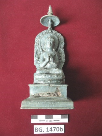 Agama Buddha diketahui telah berkembang di Jawa pada abad ke-8. Hal ini diketahui melalui keterangan Prasasti Hampra (750 M) yang ditemukan di Salatiga. Prasasti tersebut mengabarkan tentang pendirian tanah perdikan untuk kepentingan bangunan keagamaan bercorak Buddha oleh Rakai Panangkaran. Rakai Panangkaran merupakan raja Mataram Kuno yang diperkirakan memerintah pada tahun 746 M - 784 M. Melalui Prasasti Kalasan (778 M) dan Prasasti Kelurak (782 M) yang ditemukan di Kalasan dan Candi Sewu, dapat diketahui bahwa wilayah kekuasaannya mencakup wilayah Jawa Tengah dan Daerah Istimewa Yogyakarta pada masa sekarang. Kedua prasasti tersebut berkaitan dengan pendirian tanah perdikan untuk bangunan keagamaan Tara dan biara Buddha, serta pekerjaan dharma di Candi Sewu. Dalam Prasasti Manjusrigrha (792 M) dituliskan bahwa penerus takhta Mataram Kuno berikutnya, yakni Rakai Panaraban (784 M - 803 M), memerintahkan dilakukannya pekerjaan dharma berupa pendirian menara di Candi Sewu. Pada tahun yang sama Rakai Panaraban juga memberikan persembahan untuk biara Buddha di perbukitan Ratu Boko (Prasasti Ratu Boko 792 M). Prasasti Plaosan (Abad 9) juga menuliskan persembahan Rakai Panaraban untuk kepentingan biara Buddha Mahayana yang dibangun untuk para biksu dari Gujarat. Memberikan persembahan merupakan praktik yang umum dilakukan penguasa pada masa Jawa Kuno. Persembahan merupakan tanda kebaktian dan dharma kepada dewa yang diharapkan dapat melancarkan kehidupan di akhirat. Prasasti-prasasti di atas memberikan keterangan mengenai persembahan yang dilakukan oleh Rakai Panangkaran dan Rakai Panaraban untuk biksu-biksu yang didatangkan dari berbagai wilayah di India, yakni dari Bengal (Prasasti Kelurak 782 M), Sri Langka (Prasasti Ratu Boko 792 M), dan Gujarat (Prasasti Plaosan Abad ke-9). Persembahan yang diberikan berupa tanah perdikan, bangunan biara, dan arca. Arca merupakan perwujudan atau personifikasi dari dewa dan pada umumnya ditempatkan di dalam bilik maupun relung candi dalam ukuran besar. Arca yang dibuat berukuran kecil pada umumnya merupakan arca istadewata, yakni arca yang diperuntukkan bagi individu maupun keluarga. Dalam aliran Buddha Mahayana, Dhyani Buddha Wairocana dikenal sebagai bodhisattwa utama. Wairocana menguasai pusat mandala dan melambangkan elemen kosmik Rupa atau bentuk. Wairocana merupakan perwujudan dari pengetahuan yang ideal dan mewakili musim Hemanta atau musim gugur. Wairocana digambarkan dengan simbol berupa cakram dan warna putih. Arca Dhyani Buddha Wairocana ditemukan pada bulan Agustus 1995, saat dilakukan kegiatan ekskavasi tahap I di Situs Gampingan. Situs tersebut secara administratif berada di Dusun Gampingan, Desa Sitimulyo, Kecamatan Piyungan, Kabupaten Bantul. Secara geografis terletak pada koordinat 110°26'10,06" Bujur Timur dan 7°50'09,50" Lintang Selatan, dengan ketinggian 56,47 dari permukaan air laut. Selain Arca Dhyani Buddha Wairocana, temuan lain dari ekskavasi ialah ditemukan 4 (empat) deret struktur bangunan candi dari bahan batu putih, struktur stupa, dua arca perunggu, arca Bodhisattwa dari batu andesit, fragmen arca Aksobhya dari keramik, fragmen keramik, lempengan emas, serta periuk. Arca Dhyani Buddha Wairocana masuk sebagai koleksi Balai Pelestarian Cagar Budaya Provinsi Daerah Istimewa Yogyakarta dengan nomor inventaris BG. 1470b pada 8 April 1996. |