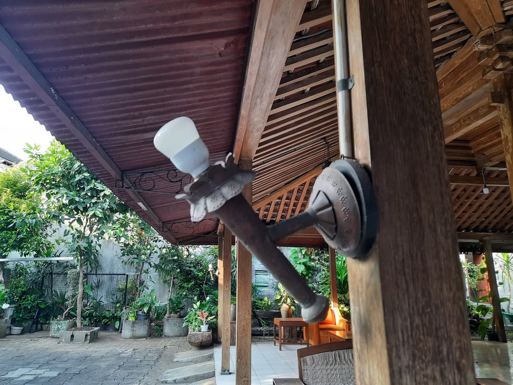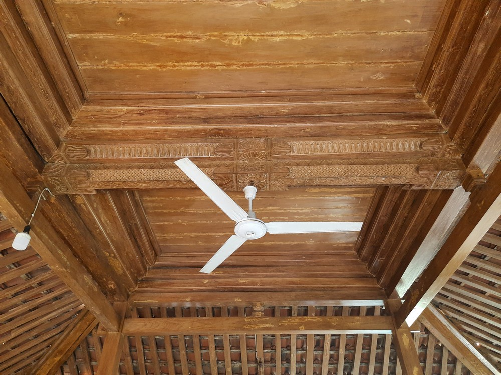 Kanopi dibuat dengan bahan seng. Sebagai penyangga kanopi, pada masing masing tiang kayu emper dipasang siku dari bahan besi cor berornamen lengkung.