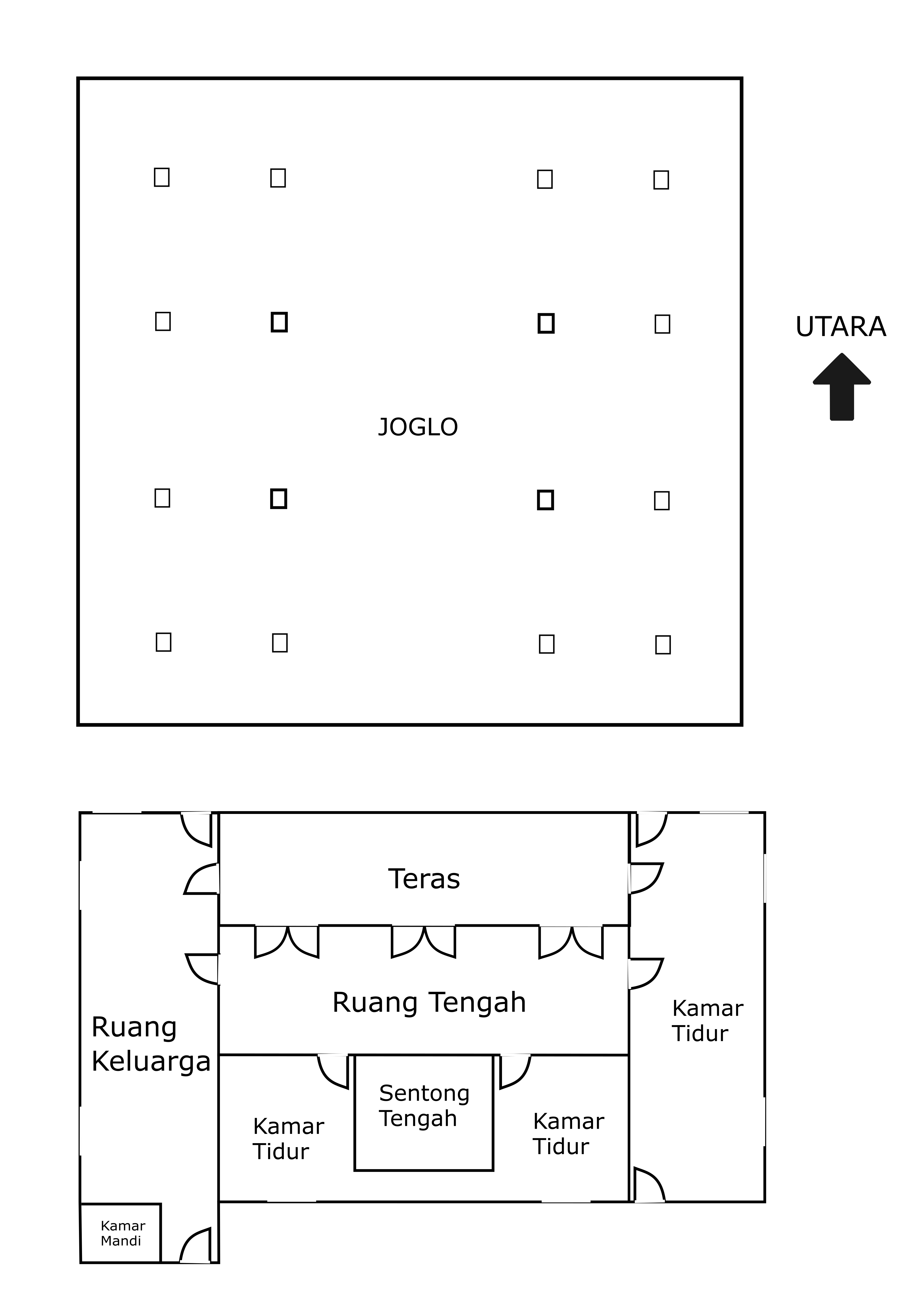 Bangunan Joglo menempati sisi utara lahan. Joglo memiliki denah persegi panjang dengan ukuran luas 9,20 x 8,30 meter persegi. Joglo tersebut berpa bangunan tanpa dinding penutup dengan deskripsi sebagai berikut : Joglo bertipe lawakan yang terdiri atas 16 tiang, empat diantaranya sebagai saka guru. Saka guru tersebut menyangga struktur joglo berupa brunjung yang terdiri atas : sunduk, uleng, tumpangsari, dada peksi, ander, dan blandar. Tumpangsari bertingkat 3 sementara uleng bertingkat 5. Empat buah emprit gantil berfungsi sebagai pengunci blandar lar-laran. Dhadha peksi berukir dengan ornamen geometri. Seluruh permukaan kayu di beri pewarna kayu coklat muda. Sementara itu pada bagian dasar saka guru beralaskan umpak dari batu berwarna hitam. Lantai ditutup dengan pasangan keramik berwarna putih. Lantai joglo ditinggikan 20 meter dari permukaan halaman. Dinting tepi lantai seluruhnya ditutup dengan pasangan tegel.